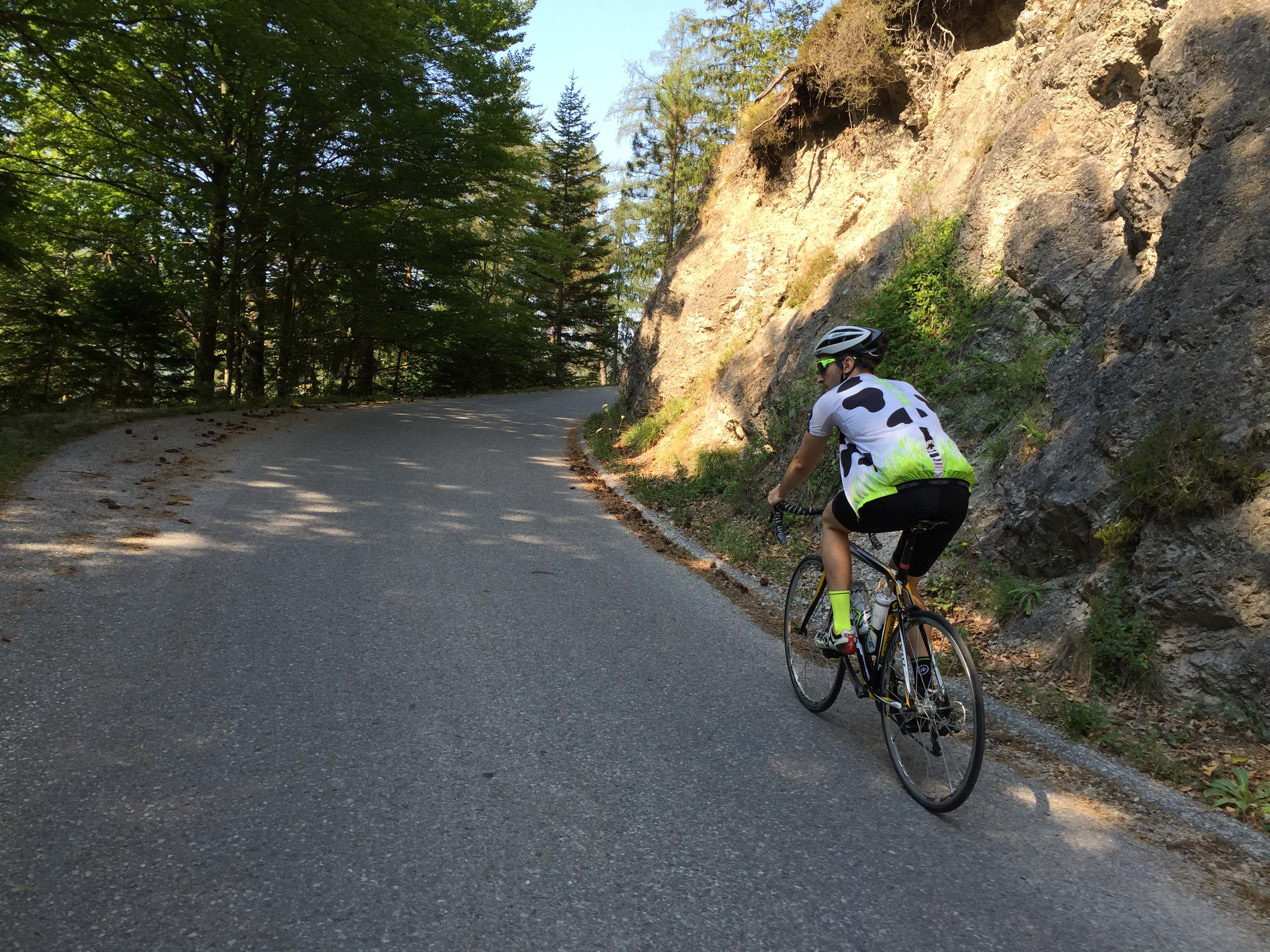 Nachdem Andy nicht nur in aller früh mit dem Auto eine Hauswand geküsst hatte, sondern wir auch noch auf halben Weg kehrt machten (weil ich meine Allergietabletten vergessen hatte) und Andy dann letztendlich panisch nach seinem Handy suchte (das sich übrigens während der ganzen Panikattacke in seiner Trikottasche befand), konnte es endlich los gehen. Gestartet wurde in Bad Fischau in Richtung Piesting und retour über das Klostertal/Höllental. Soviel zum Plan. Ausgestattet war ich also mit Taschentüchern (Allergikerangewohnheit), Asthmaspray, 2 Liter Wasser, Energieriegel und für alle Fälle – ein Energie-Gel. Auf auf!
