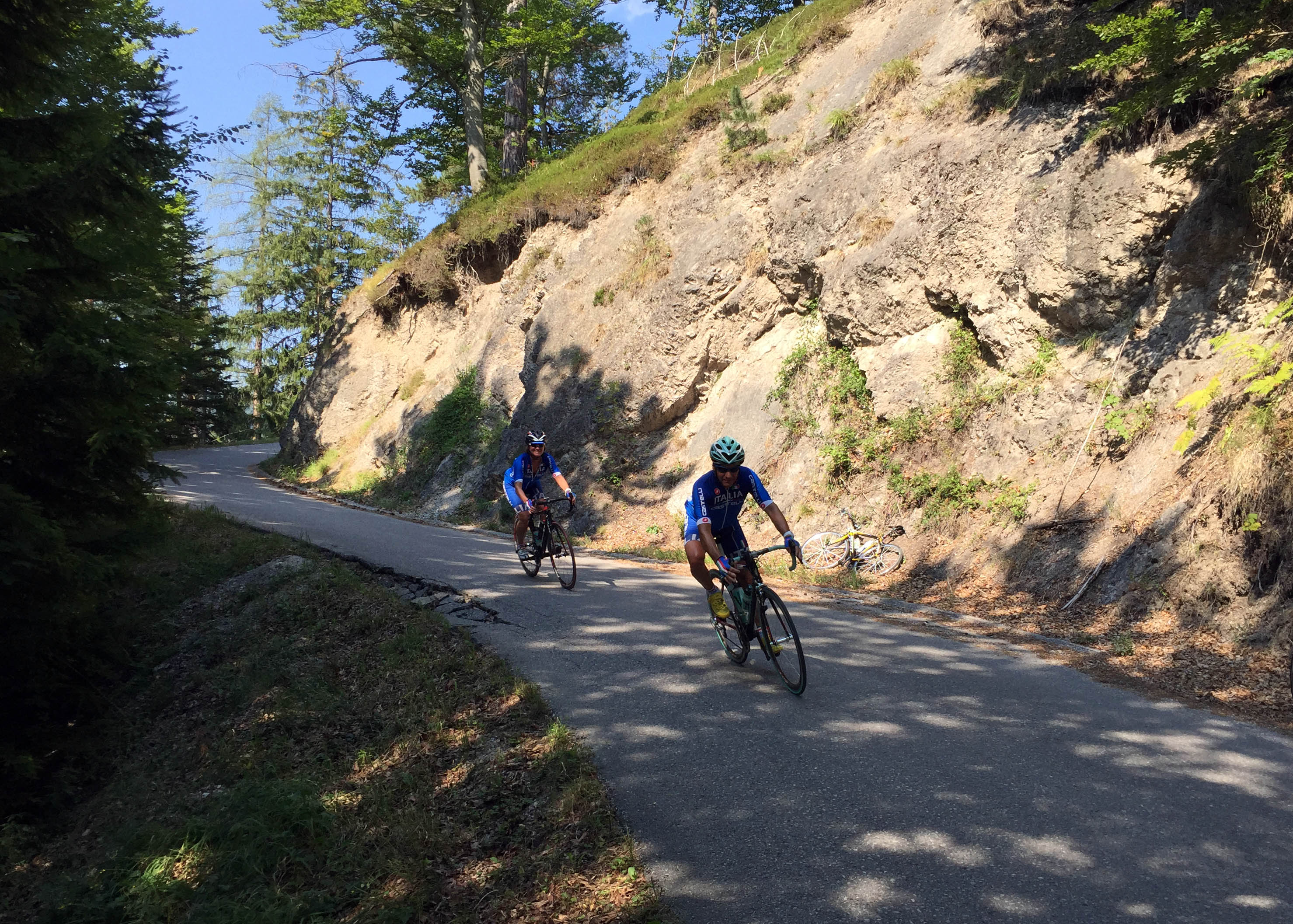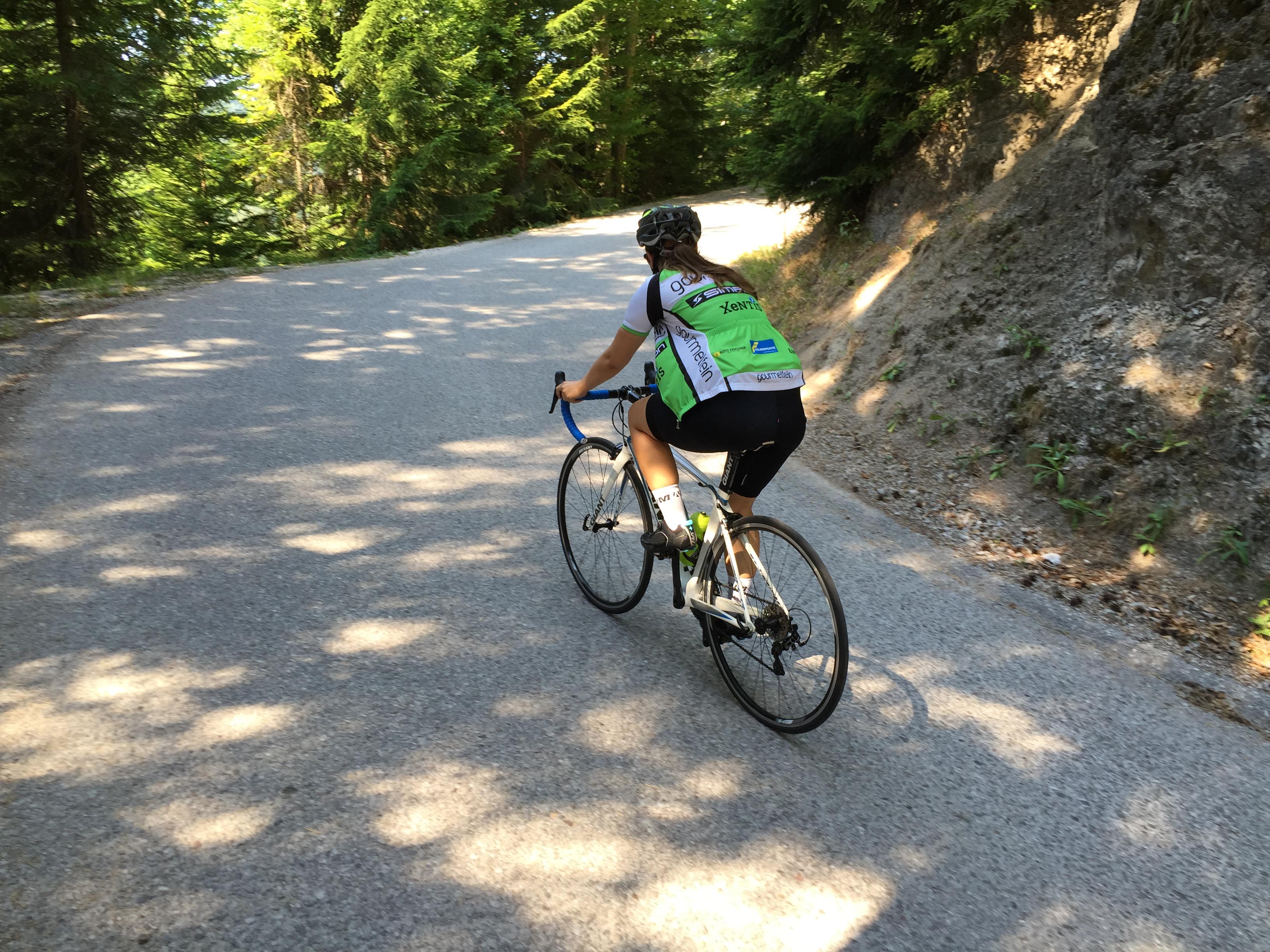 Da unser Tag ja wirklich sehr komisch gestartet war, hatte ich anfangs Schwierigkeiten mein Tempo zu finden und teilweise trottete ich einfach nur hinter den anderen her. Ich war sehr still und Andy machte sich schon Sorgen, aber ich fand einfach nicht mein Tempo und auch nicht meine optimale Sitzpostition, das nervte. Zum Glück wurde es irgendwann besser und ich hatte wieder riesen Spaß am radeln, doch so richtig weit waren wir noch immer nicht gekommen. Bei Gutenstein machten wir einen kleinen Abstecher (der ca. 8-10 Kilometer lang war). Dieser führte hinauf auf die Haselrast mit einer durchschnittlichen Steigung von 10%. Judy und Harald fuhren in ihrem Tempo voraus und waren nach kurzer Zeit aus unserem Blickfeld verschwunden. Die Landschaft war traumhaft – rings um uns waren unzählige Fichten und Sonne und Schatten wechselten sich spielend ab. Es roch nach Wald und einfach nur nach Natur, denn dort waren kaum Autos unterwegs. Andy und ich fragten uns, was dort wohl der Quadratmeter kostete, das wär‘ dort was für die Pension 😉