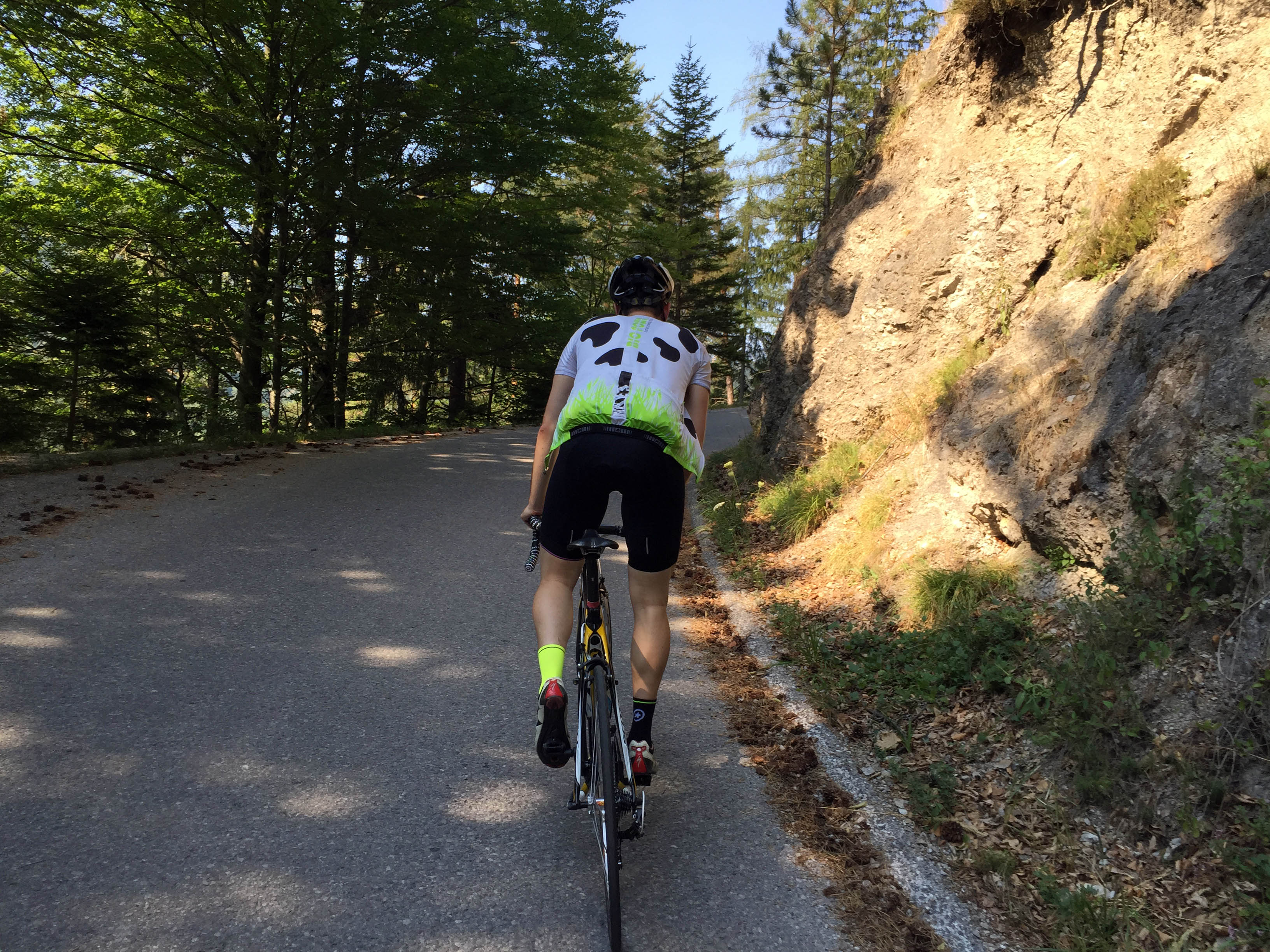 Nach der Abfahrt ging es also endlich in Richtung Höllental. „in Richtung“ trifft es hier auch am besten, denn der Weg war lang und erschwerlich. Ich war wirklich schon komplett am Ende und wir hatten gerade einmal die Hälfte der Strecke hinter uns! Dieses Klostertal zog sich sowas von in die Länge, das war sagenhaft. Nichts bekam ich mit von der schönen Natur, ich hatte nur eins im Blick, den Asphalt auf dem mein Rennrad sich vorwärts bewegte. Also war es so weit, das Gel musste mich retten. MAN IST DAS EKELIG. Die Sonne hatte dieses zuckersüß gelige Etwas so aufgewärmt, dass ich sogar meinen Brechreiz unterdrücken musste. Puh, das Gel wirkte, doch das Wasser wurde knapp und wir hatte noch immer 20 Kilometer vor uns, bis wir endlich Wasser auffüllen konnten. Es war eine Tortur. Das Tal war nicht so kühl wie wir uns das alle erhofft hatten. Die Hitze machte uns allen zu schaffen, aber mir besonders, da ich ja erst seit April am Rennrad saß. Nicht nur, dass ich schon kraftlos dahin trottete, tat mir zu allem Übel auch noch mein Popschi total weh, also musste ich teilweise im Wiegetritt durch das Klostertal radeln.